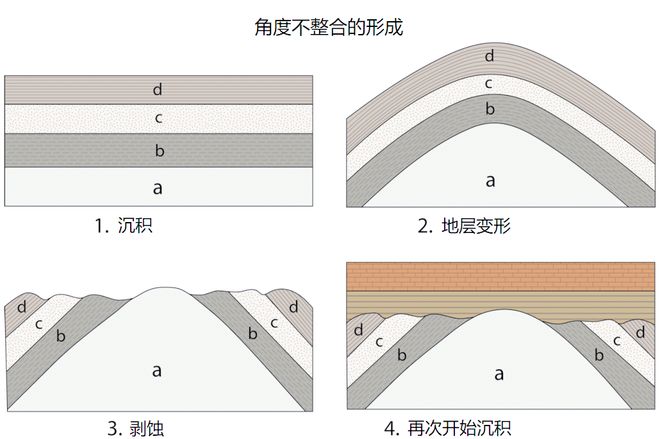 ②角度不整合:上下地层不平行,呈一定角度相交,中间缺失部分时代地层,有沉积间断和构造变动(如褶皱)。反映先沉积、后褶皱抬升剥蚀、再下降沉积。