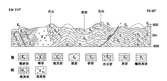 (4)地形线:剖面图顶部通常有地形线(地表起伏),结合地质构造分析地貌成因(如背斜成谷、向斜成山)。