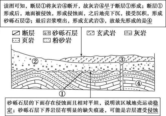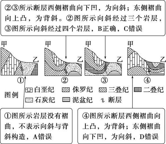 ③判断依据:观察两侧岩层的错动方向和地层重复或缺失现象。注意结合断层面倾向和岩层运动方向。