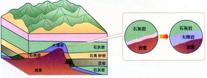 (1)侵入岩体:如花岗岩体,呈不规则的块状、脉状等形态侵入围岩中。与围岩为侵入接触,岩体边界切割围岩层理/片理。