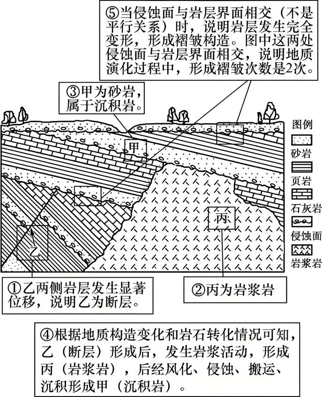 5.地质事件顺序颠倒:未正确利用切割关系(如断层切穿褶皱,则褶皱先形成;岩浆岩侵入地层,则地层先形成;地层覆盖岩浆岩,则岩浆岩先形成)。