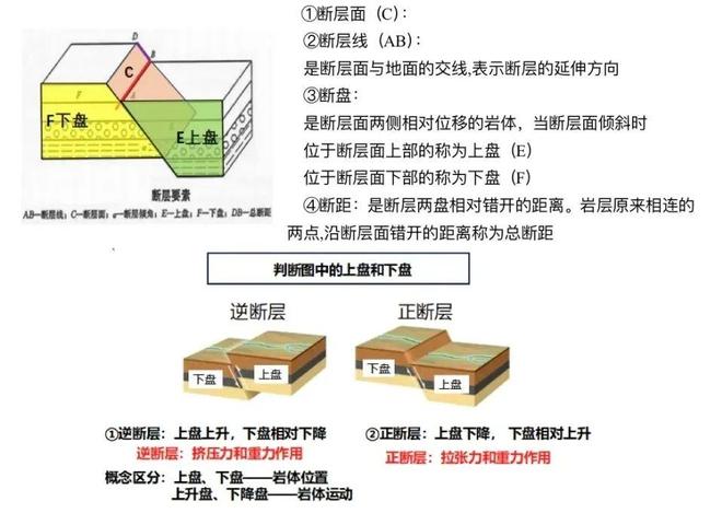 ①概念:岩层发生明显错动和位移的断裂构造。有断层面、断层线、上盘、下盘。